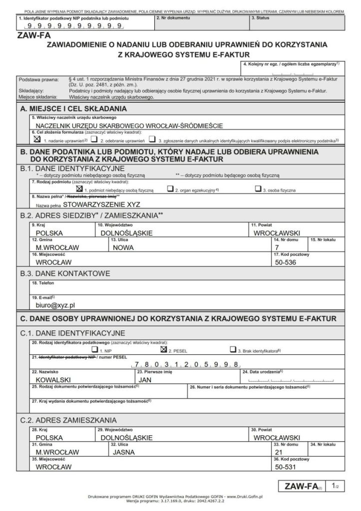 W przypadku podmiotów niebędących osobami fizycznymi (np. stowarzyszenie, fundacja), zaleca się, aby dokument ZAW-FA został złożony na osobę zarządzającą podmiotem (np. prezesa). Ta osoba, po autoryzacji w KSeF, staje się administratorem uprawnień i to ona nadaje dalsze uprawnienia do wystawiania faktur lub odbioru faktur, w tym dla biura rachunkowego czy pracowników.