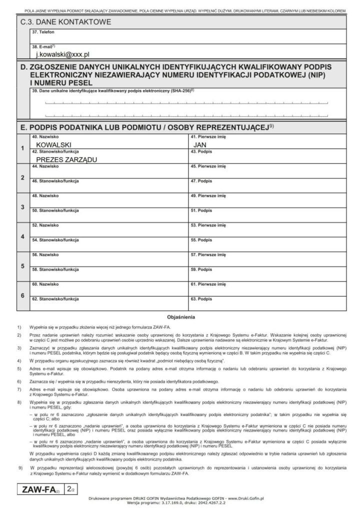 Za pomocą jednego formularza ZAW-FA można upoważnić tylko jedną osobę. Dalsze uprawnienia osoba fizyczna wskazana w ZAW-FA może nadawać elektronicznie (np. za pomocą autoryzacji w systemie KSeF).
